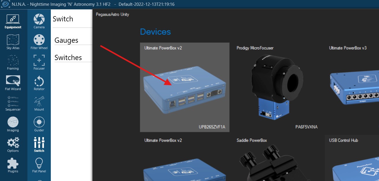 - In the example above, we connected the UPBv2 to control the embedded switches, i.e. power and USB ports using the Pegasus Unity ASCOM driver within the imaging software.